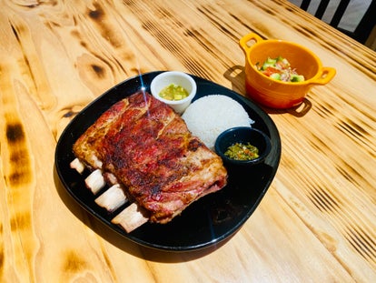 Côtes levées tendres de porc, grillées sur vrai charbon de bois.